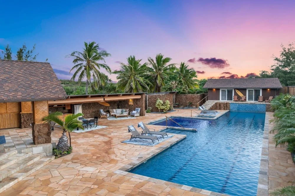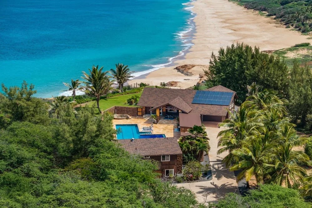 Perched above one of Hawaii’s longest white sand beaches, The Bluff House is a private 5.29-acre oceanfront estate offering breathtaking coastal views, unmatched privacy, and pure island serenity. Behind the gated entry, a substantial custom drive leads to the main home and a separate guest cottage. At the heart of the property is a lush outdoor oasis featuring a resort-style pool and hot tub with waterfall, outdoor kitchen, and fire pit lounge—perfect for relaxing or entertaining. The main residence includes 3 bedrooms, 2 baths, and an open-concept living space with panoramic ocean views. The primary suite is a peaceful retreat with A/C and stunning vistas. The 2-bedroom guest cottage includes its own garage/workshop, bathroom and deck overlooking the pool. Meander down the path in the front yard to access the beach. Equipped with solar power, high-speed internet, and underground utilities, this modern yet off-grid-ready home is zoned agricultural and offers seclusion without sacrifice. Experience the magic of Moloka’i’s West End—a rare chance to own a slice of untouched Hawaiian paradise.